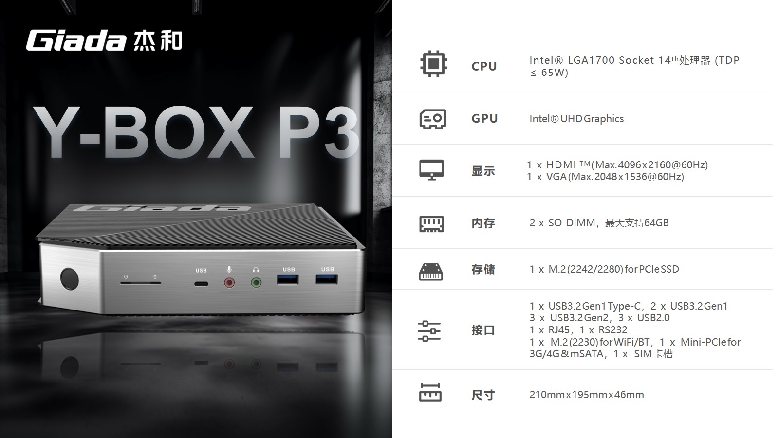 支持指纹解锁,支持type-c接口,支持PD协议的27W快充。球速体育科技最新云终端Y-BOX P3采用Intel® LGA 1700 Socket CPU插槽设计,支持intel 12~14代酷睿系列处理器,配备i7-14700处理器,20核28线程,最大睿频频率为5.4GHz,处理器基础功耗 65W。采用双通道笔记本内存槽设计,最大支持容量可达64GB,最高支持DDR5-5600MHz频率,比 DDR4 至高标准数据速度 3200MT/S多传输 1.75 倍。