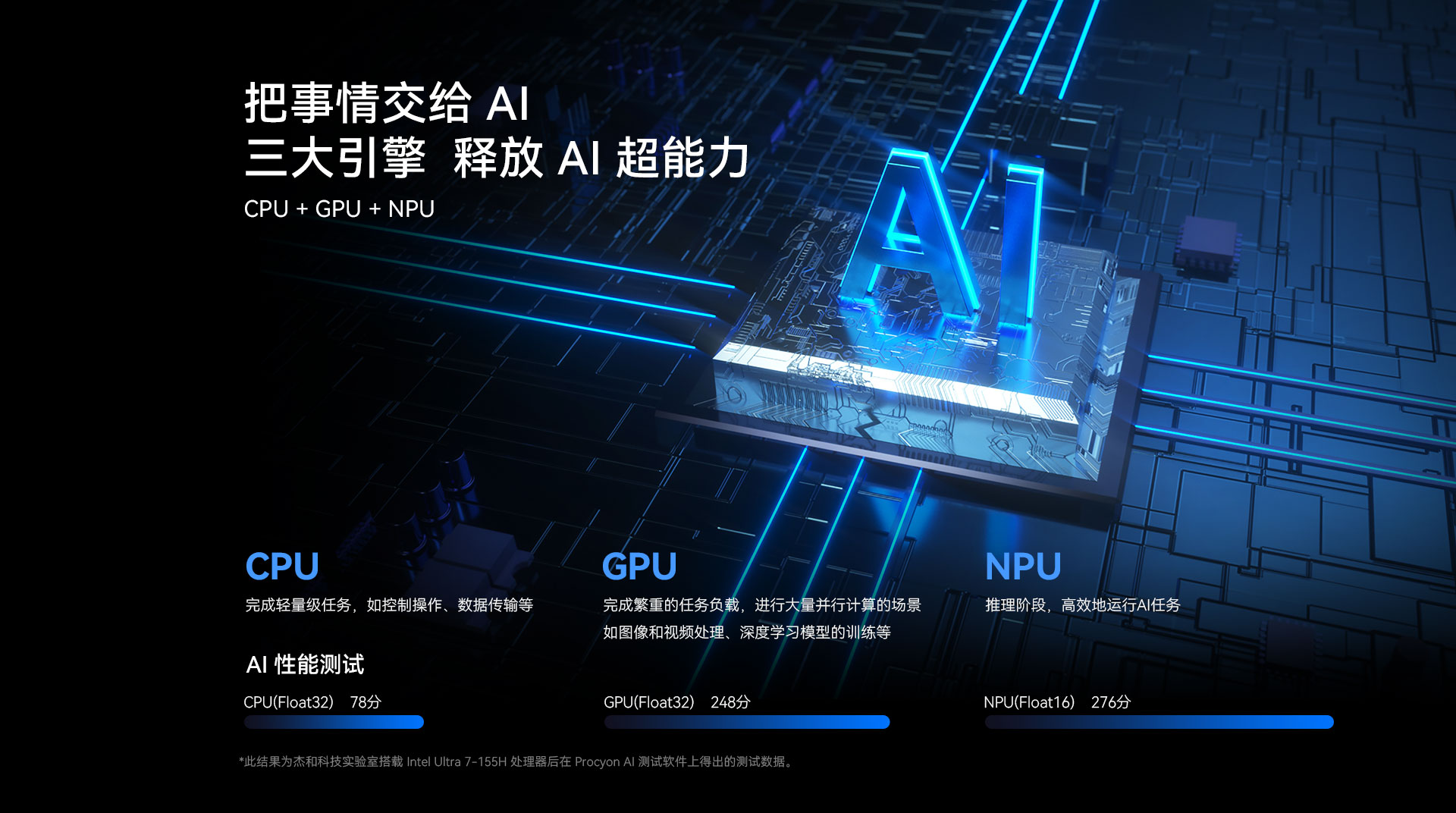 球速体育科技N601搭载了Intel® Core™ Ultra处理器,可选配Ultra 5- 125H或Ultra 7-155H,全新架构拥有CPU、GPU 和NPU配置。在球速体育科技实验室里,球速体育专门用 Procyon AI 这款 AI 性能测试软件对搭载了 Ultra 7-155H 处理器的 N601 进行了测试。最后测试结果显示,N601的CPU分数为78分,GPU 分数为248分,NPU分数为276分,这意味着N601在AI处理方面具有显著优势,能够高效地处理复杂的神经网络计算任务。
