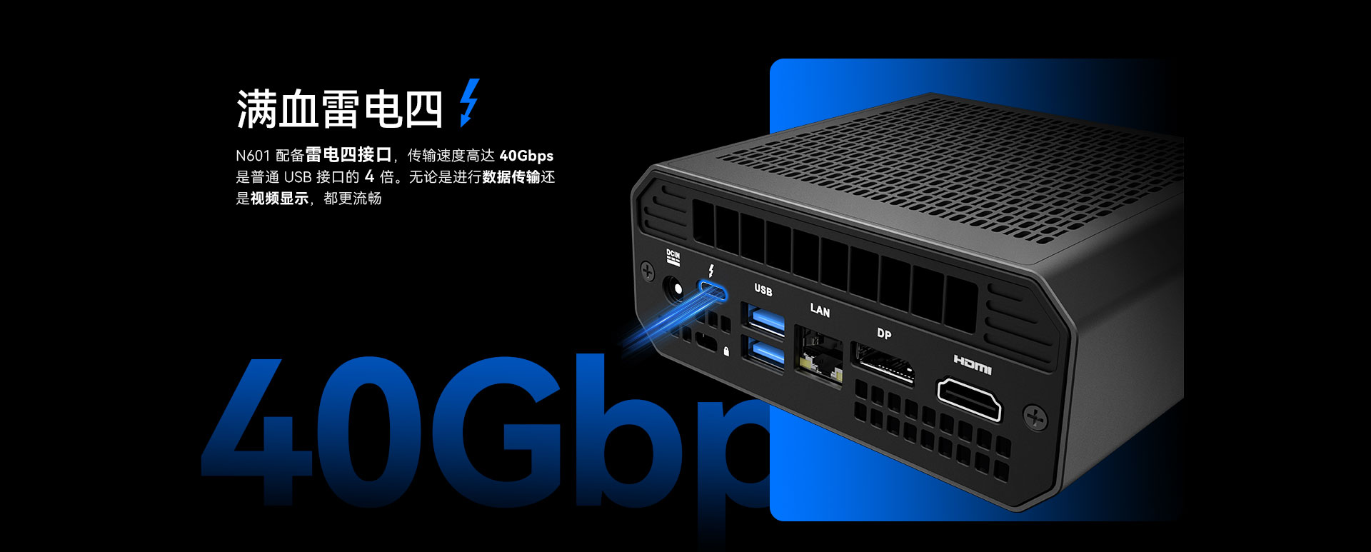 球速体育科技N601配备雷电四接口,传输速度高达40Gbps,用户可通过该接口连接2块屏幕。还可通过HDMI2.1接口,DP1.4接口再连接两块屏幕,实现四屏异显。雷电四还可以连接外设,如鼠标、键盘、控制器和耳机等。