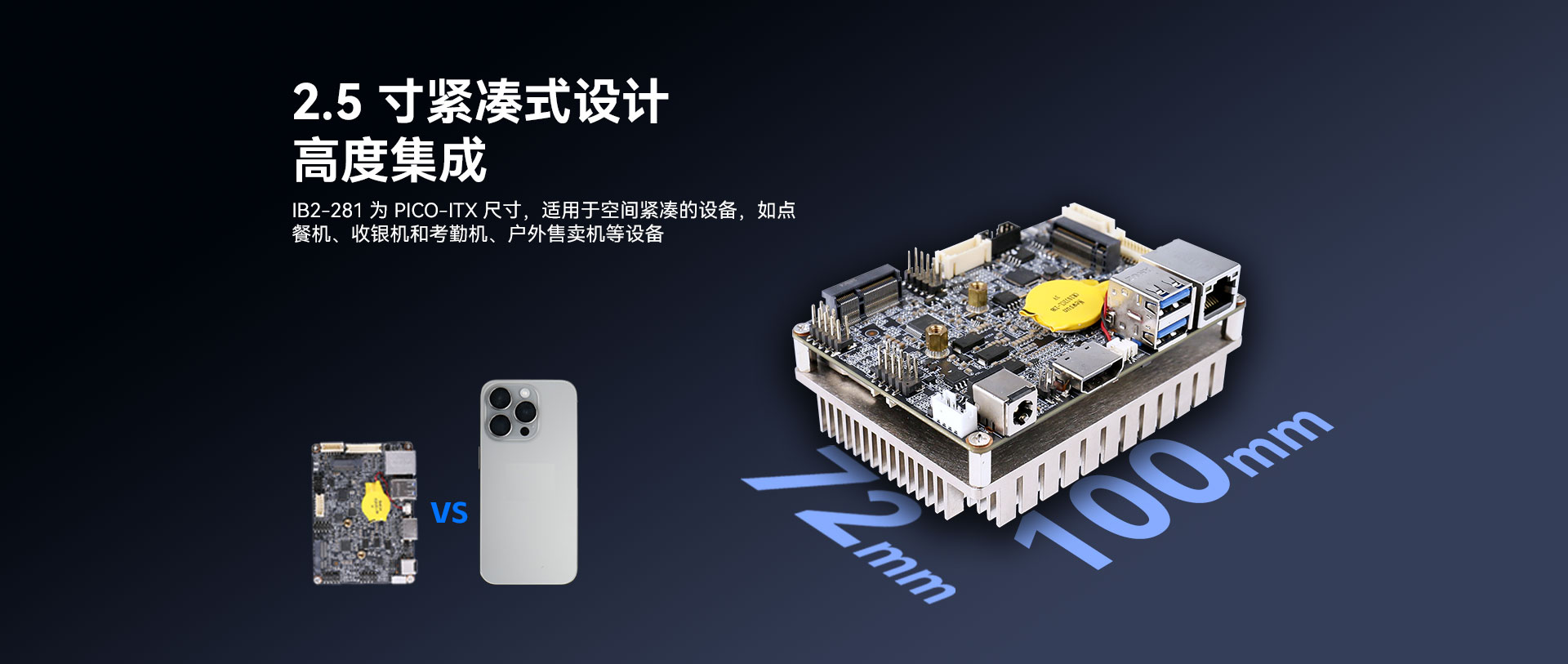无风扇嵌入式主板去掉了风扇这一易损部件,消除了因风扇故障引发的系统问题,提高了系统的稳定性和可靠性。它采用了高度集成化的设计,体积更为小巧,如球速体育科技Pico-ITX主板IB2-281,其2.5寸紧凑式设计,适用于点餐机、收银机和户外售卖机等空间有限的应用场景。这种主板通常具备低功耗的特性,减少了能源消耗,也降低了发热。而且,它的稳定性极佳,能适应各种复杂环境。