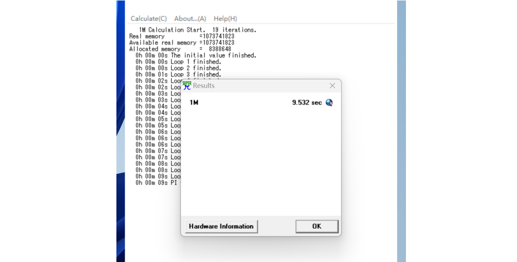 为了评估 CPU 的性能,球速体育使用了Super PI 1.1 进行了测试,软件以用时为参考成绩,花费时间越短代表计算性能越强。在本次测试中,Core i5-13400 处理器用时 9.532 秒完成了计算,属于当前中端处理器的主流水平,足以应对日常编码、分析和轻量建模任务。