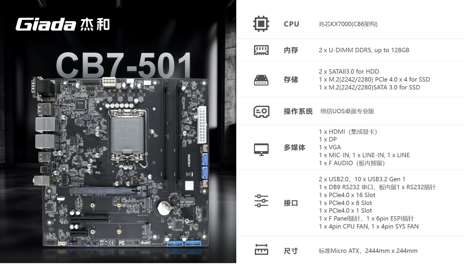 搭载兆芯开先KX-7000国产处理器,基于C86架构、8核8线程,主频达3.7GHz。支持主流双通道DDR5内存、配备了PCIe 4.0 x16 、 PCIe 4.0 x8 、PCIe 4.0 x1 插槽,满足多种扩展卡安装需求。尺寸为标准Micro ATX,244 x 244 mm大小,搭配系统为统信UOS桌面版。