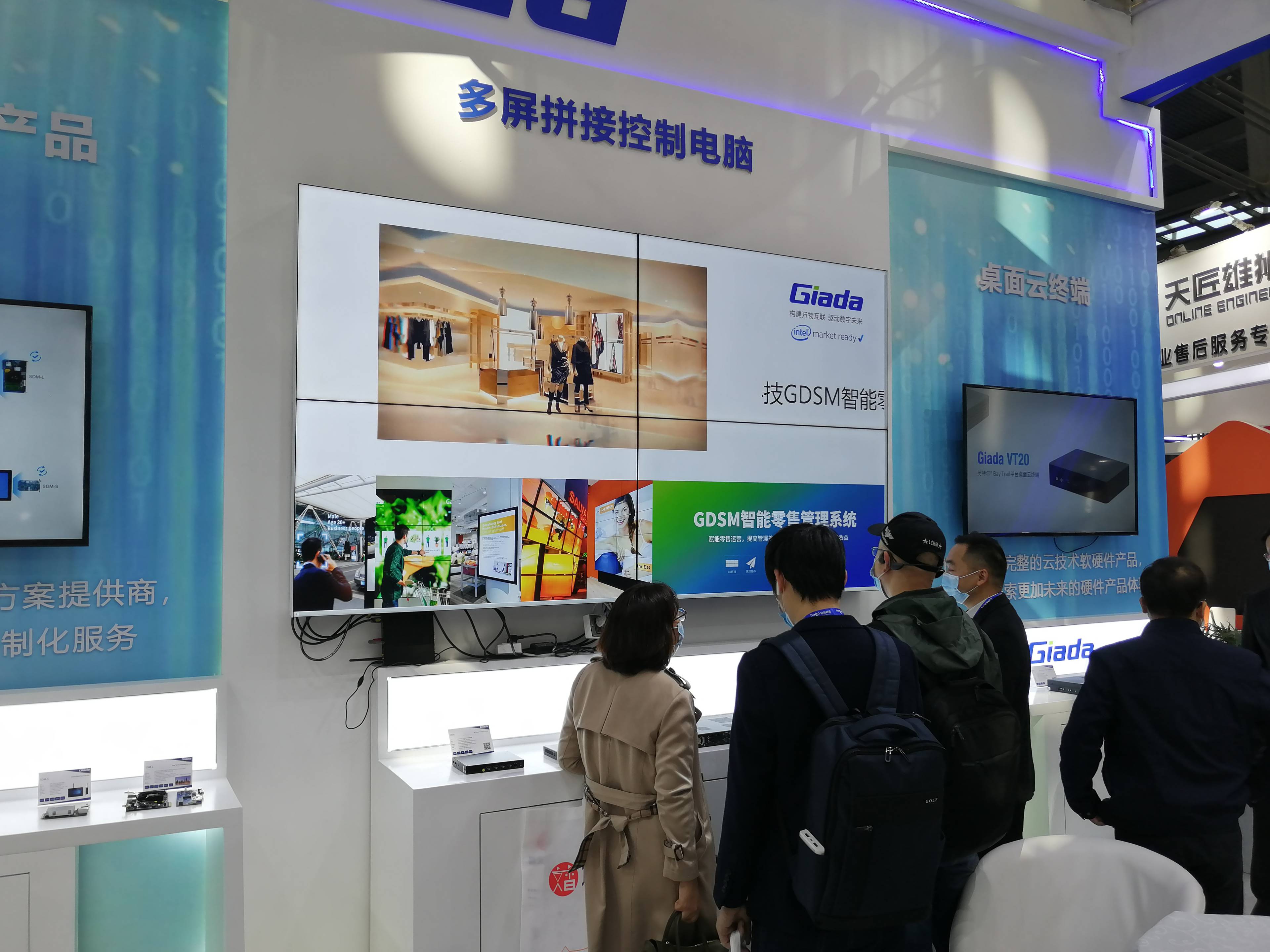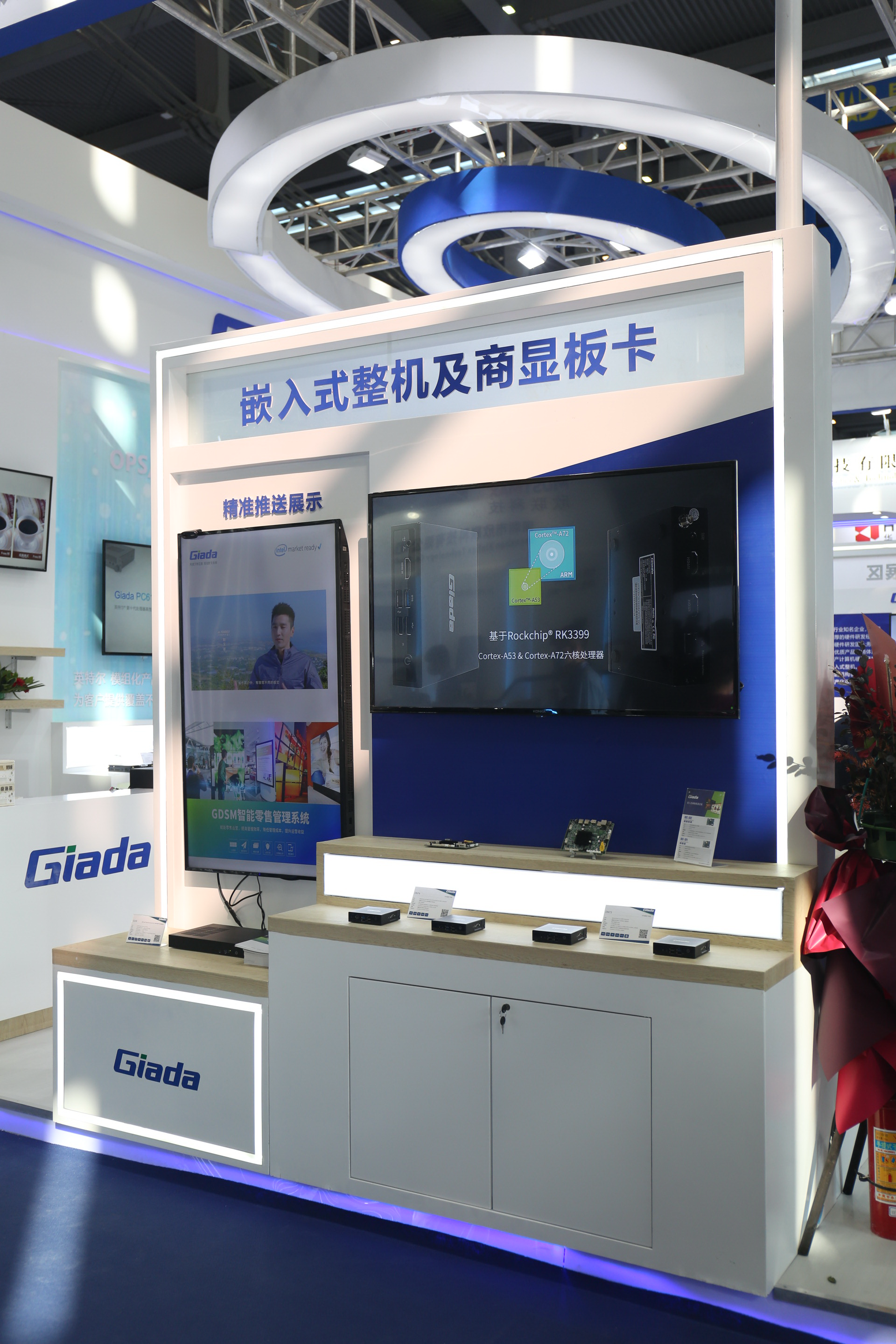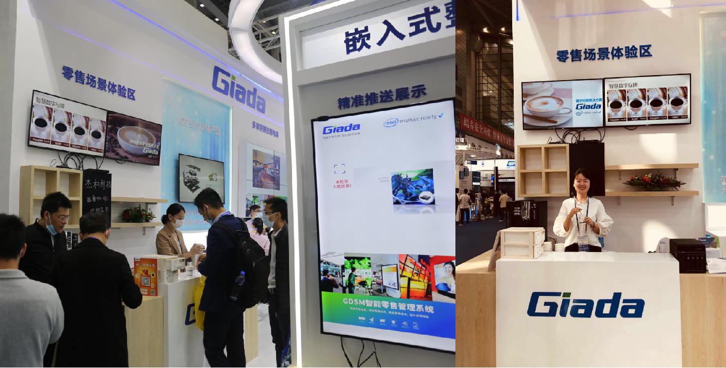 紧邻ARM架构商显产品集的精准推送展示区与零售门店模拟展区,共同组成了本届展会球速体育科技展位的一大精彩设计。场景展现了GDSM智能零售管理系统在零售门店场景下的展示效果,顶部的数字标牌由GDSM系统推送内容,模拟搭建了针对人流动线的广告精准推送形态。