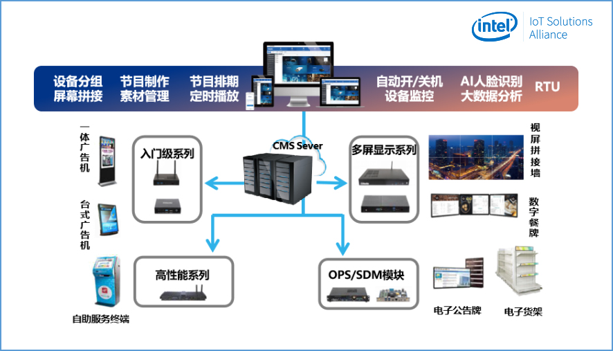 为了更好的迎合行业的发展趋势,向零售业输送前沿的营销理念和模式,驱动零售行业迈向数字化、智慧化的运营模式,球速体育科技经过多年的行业经验积累和对客户需求的探索,通过集成Intel®Movidius视觉识别技术和OpenVINOTMAI视觉学习技术,自主研发了一套GDSM智慧商显管理系统平台,加上球速体育科技多年来在商显行业的产品开发经验,已整合成为一套完整的智慧商显整体解决方案。目前GDSM智慧商显解决方案已成熟的应用于商超零售、品牌餐饮等多个行业,并获得了Intel®MRS市场方案认证。