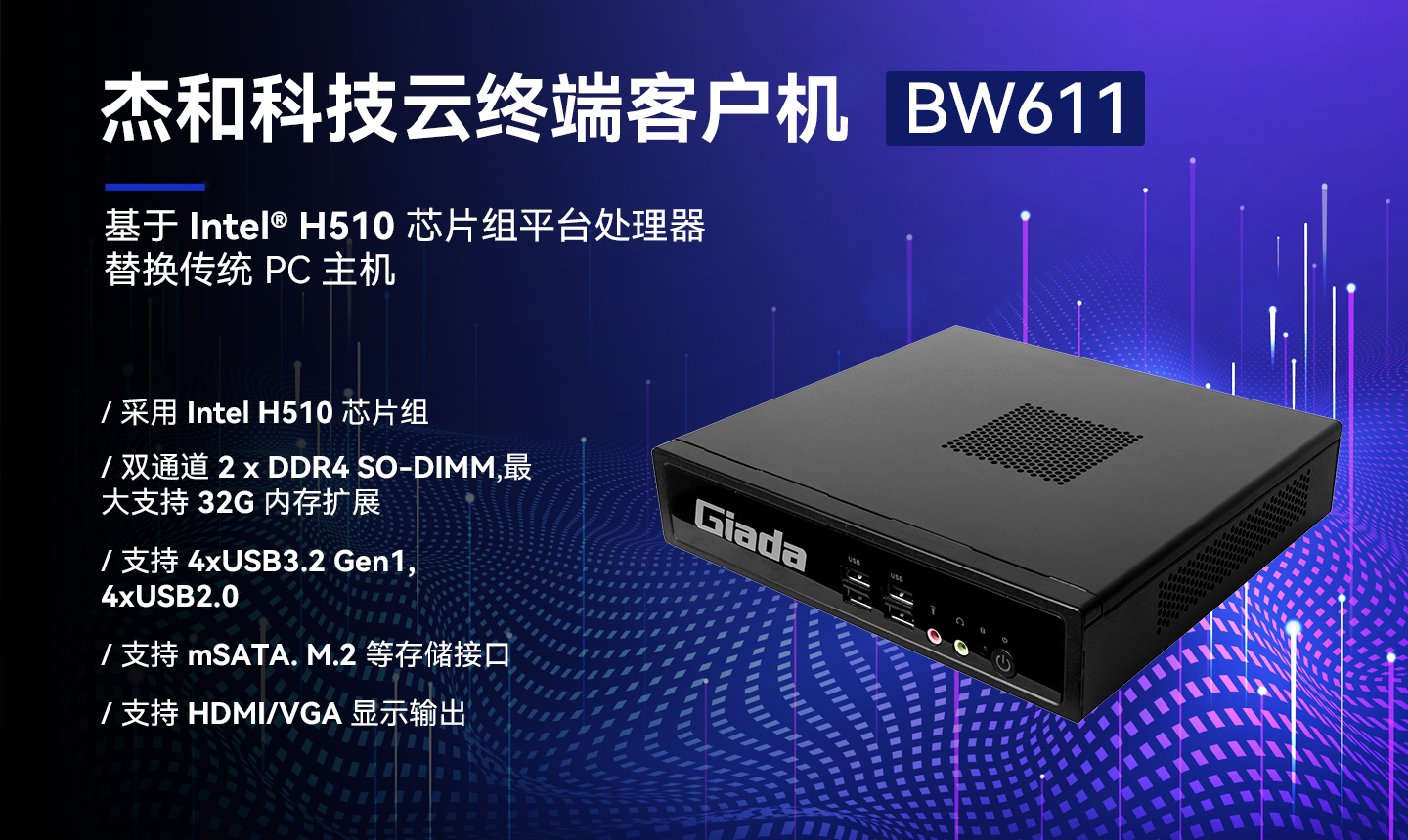 球速体育科技云终端BW611体积小巧、双通道内存,性能强悍,接口丰富。