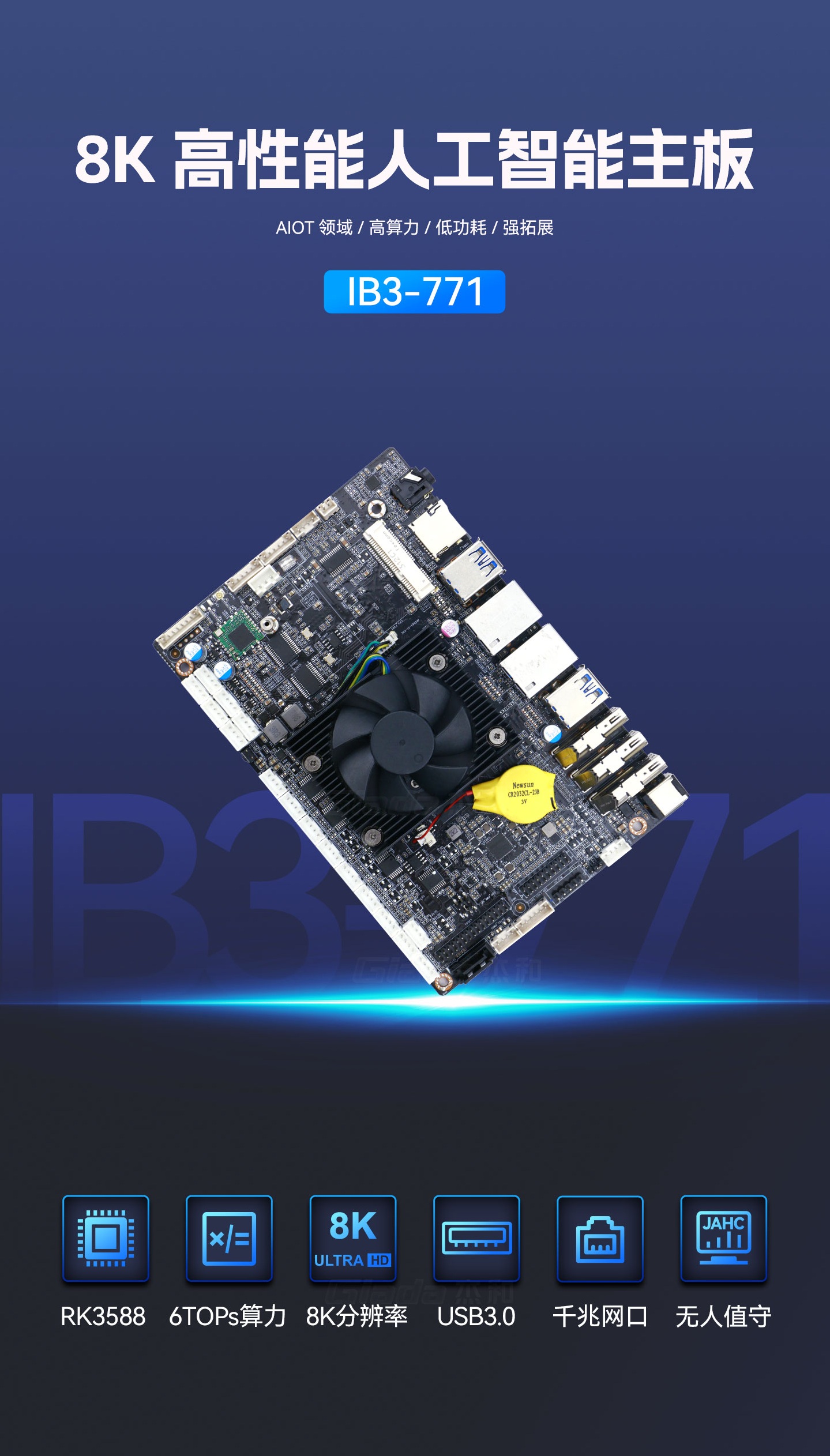 球速体育科技IB3-771采用瑞芯微全新旗舰级芯片RK3588,搭载八核64位处理器,集成ARM Mali-G610 MP4 GPU,高算力、低功耗、具备强大的视觉处理能力;性能强悍的RK3588内置AI加速NPU,提供6TOPs算力,支持主流深度学习框架,为各类AIoT应用场景提供更优的性能表现。