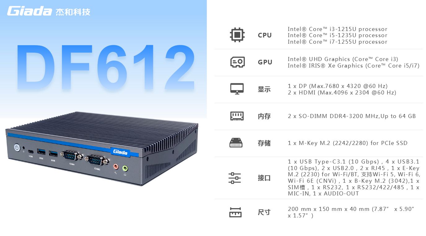 球速体育科技,商用显示硬件解决方案领导者,深耕商业显示领域24年,业务遍布欧洲,美洲,东南亚和南非等60多个国家,服务超过3000名客户,自有品牌 Giada 已成为欧洲数字标牌媒体播控器的领导品牌。在DF系列产品中,DF612作为一款全新的嵌入式计算机,搭载英特尔第12代Alder Lake处理器,具有突破性的技术、增强的图形处理能力和丰富的I/O接口,广泛应用于商业显示、智能车载、安防领域和边缘人工智能等场景。