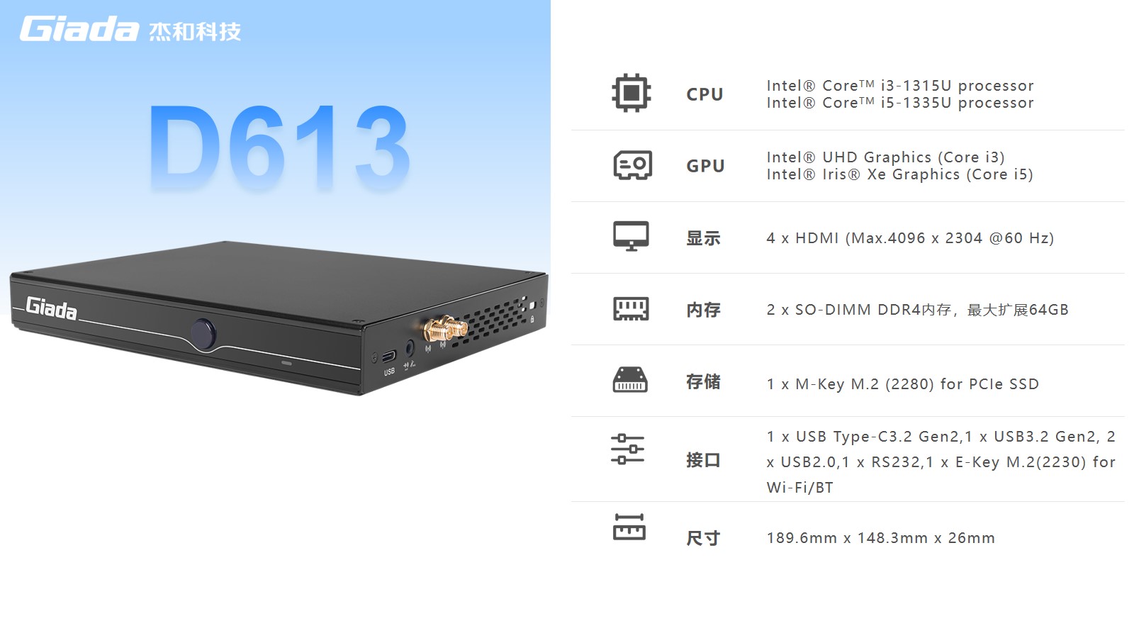 球速体育数字标牌D613搭载Intel RaptorLake Corei3-1315U/i5-1335U处理器,可以同时连接4个4K显示器,支持4K分辨率编码解码,还支持5G蜂窝网络,速度比4G LTE快10倍。