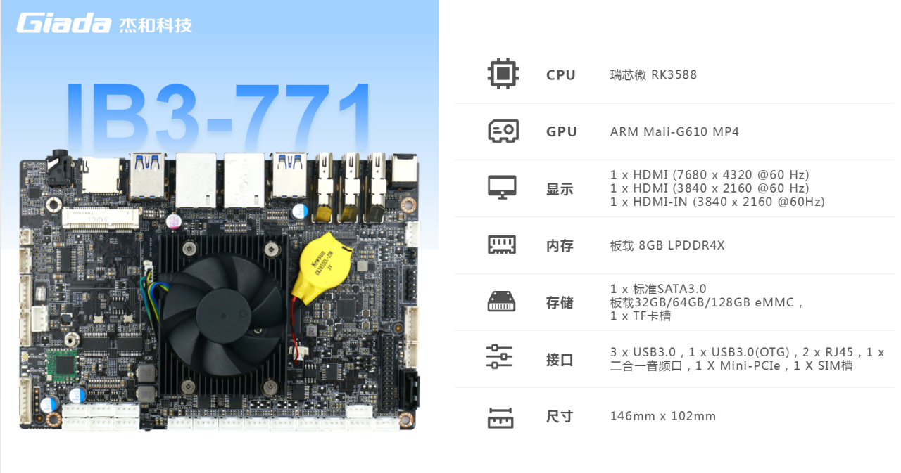 球速体育主板IB3-771搭载瑞芯微RK3588八核64位处理器,内置6TOPS算力的NPU,具备高算力、内存大、超强多媒体、多重扩展等技术优势。满足8k超高清视频的显示需求,还支持主流深度学习框架,为各类 AIOT 应用场景提供更优的性能表现,支持机器人、边缘计算、智能NVR、智能汽车、智慧大屏、AR/VR、智能自助终端场景的广泛应用。