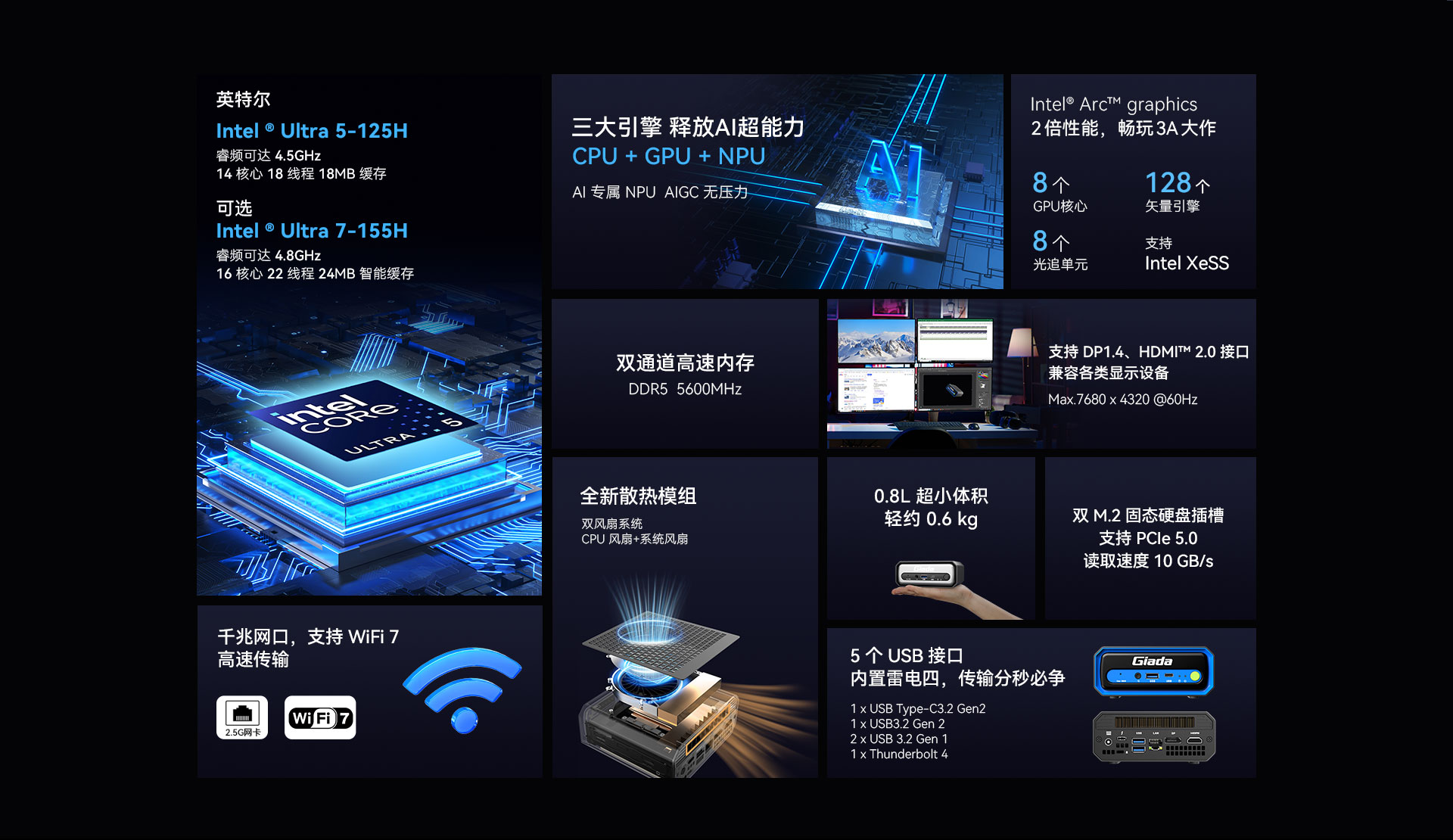 支持1 x HDMI 2.0,1 x DP 1.4,最高支持8K视频输出